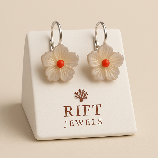 Sono in madreperla e corallo rosso autentico della Sardegna, montati su basi in argento. Materiali scelti per durata, bellezza e sicurezza per la pelle.